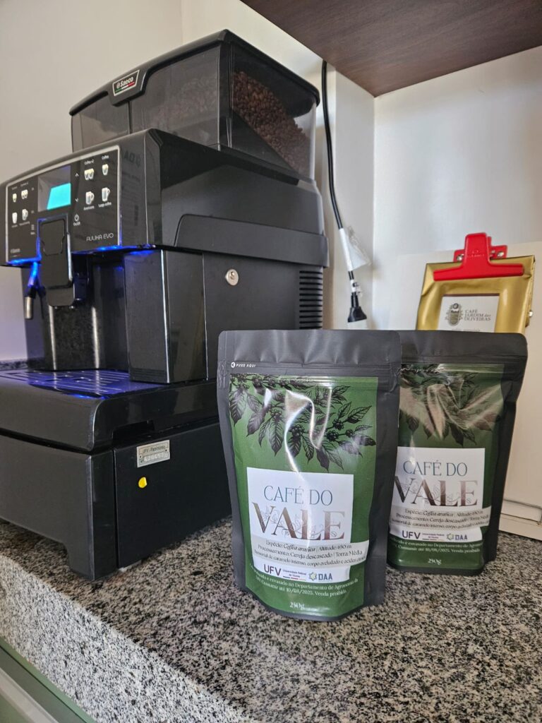Tivemos ainda no Stand, o lançamento do Café do Vale, café produzido e envasado no Departamento de Agronomia da UFV. Café da espécie Coffeaa arabica, na altitude de 620 m, com processamento natural e Torra média. Um grande trabalho feito pelas professoras Iara G. dos Santos e Adriene W. Pedroza, do DAA.